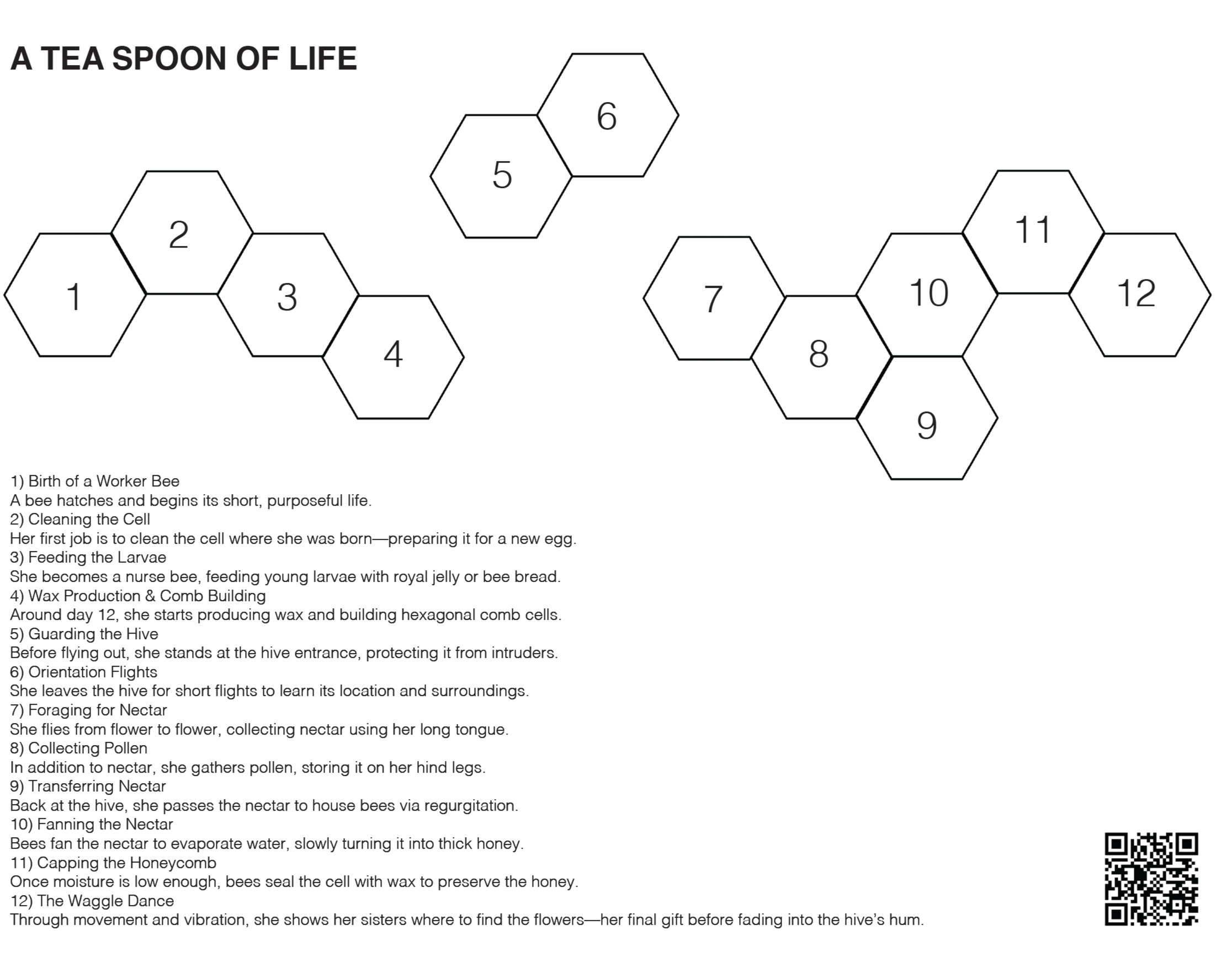 It takes twelve bees their entire lives to produce a single teaspoon of honey. This project transforms that statistic into a spatial narrative: a twelve-piece honeycomb where each hexagon marks a stage of one bee’s life.